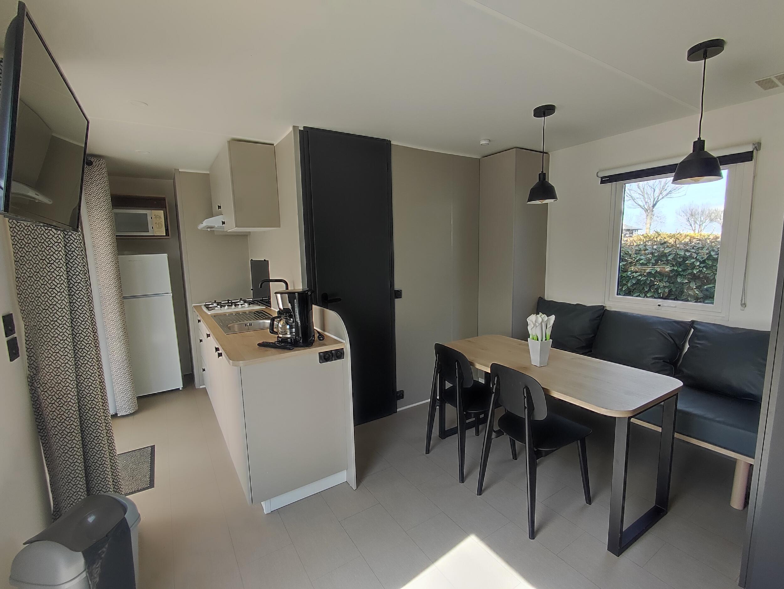 Genießen Sie einen erholsamen Aufenthalt in diesem Prestige-Mobilheim, ideal für einen ruhigen Urlaub zu zweit, mit der Familie oder mit Freunden. Das gemütliche Innere verbindet Modernität und Komfort: eine einladende Sitzbank, ein Fernseher für entspannte Abende und eine komplett ausgestattete Küche (Gaskochfeld, Nespresso, Mikrowelle, Wasserkocher, Kühlschrank mit Gefrierfach), um Mahlzeiten in Ihrem eigenen Rhythmus zuzubereiten.