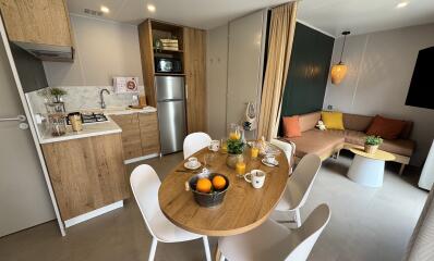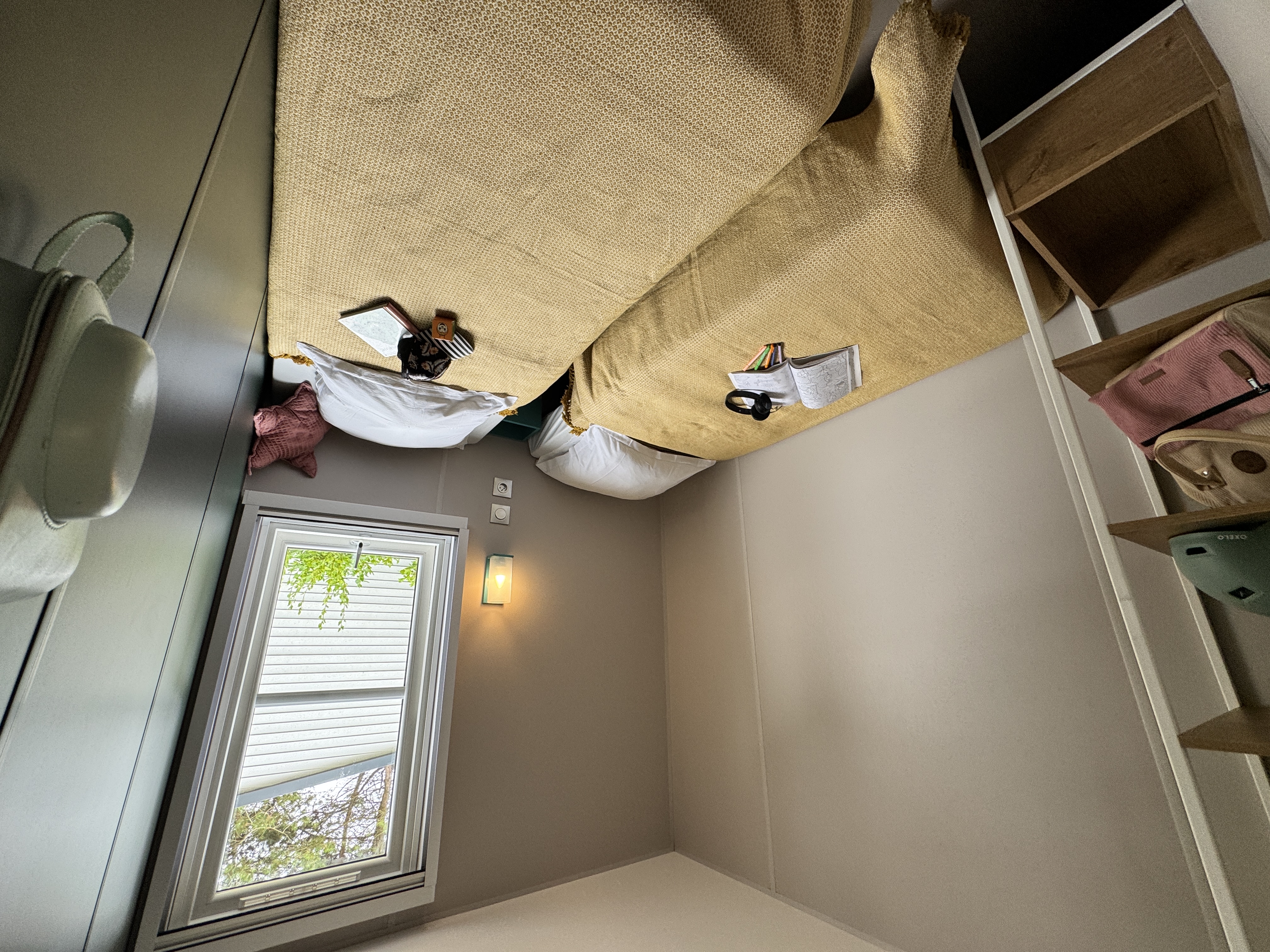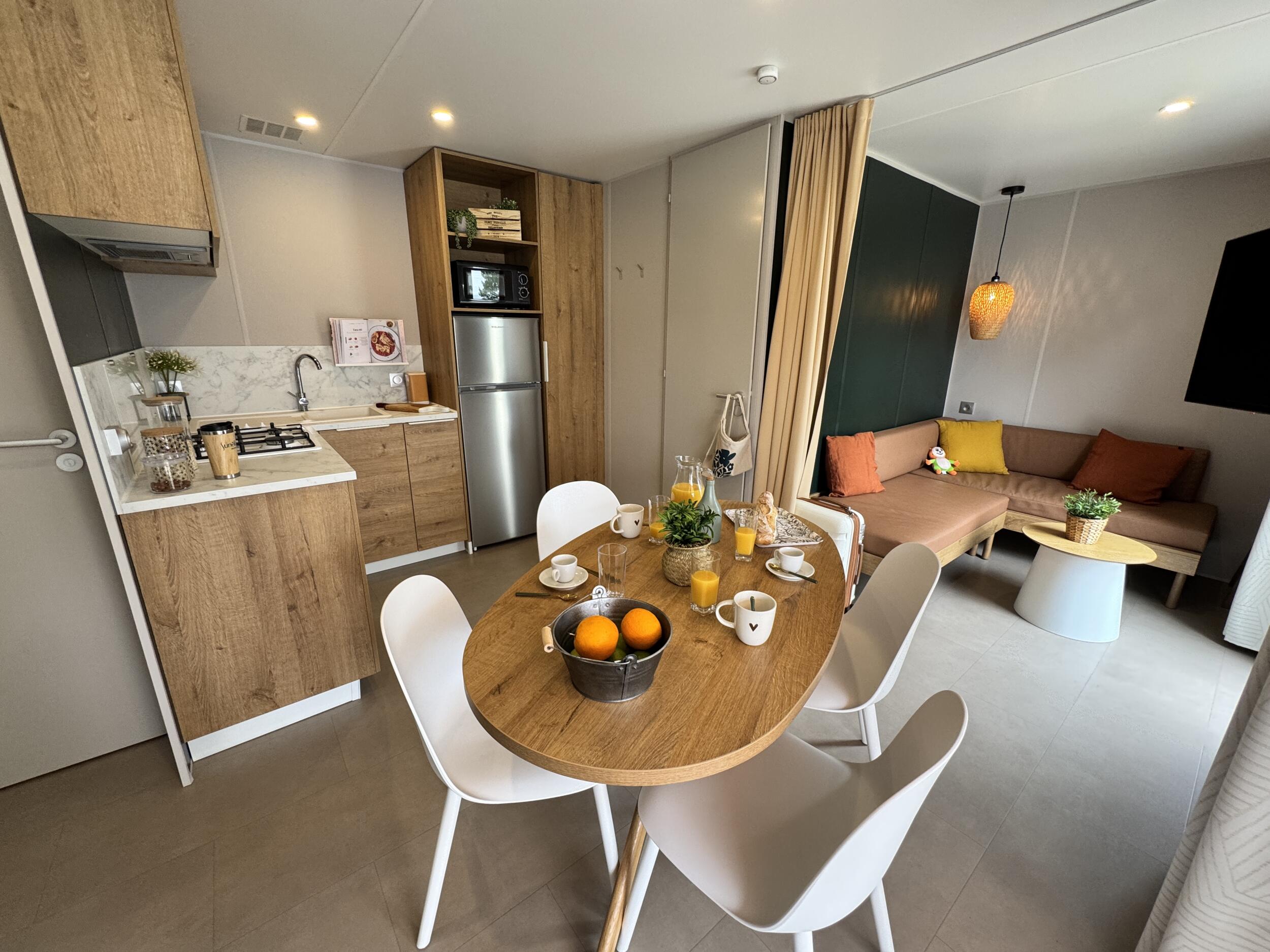 Gönnen Sie sich einen komfortablen Aufenthalt in unserem 32 m² großen Prestige+ Mobilheim – eine moderne und elegante Unterkunft, die darauf ausgelegt ist, Ihre Familie unter den besten Bedingungen zu empfangen. Der helle Wohnbereich mit ausziehbarer Bank, TV und voll ausgestatteter Küche (Gaskochfeld, Nespresso, Mikrowelle, Wasserkocher, Kühlschrank mit Gefrierfach) lässt Sie jeden Moment genießen – fast wie zu Hause, nur noch besser.