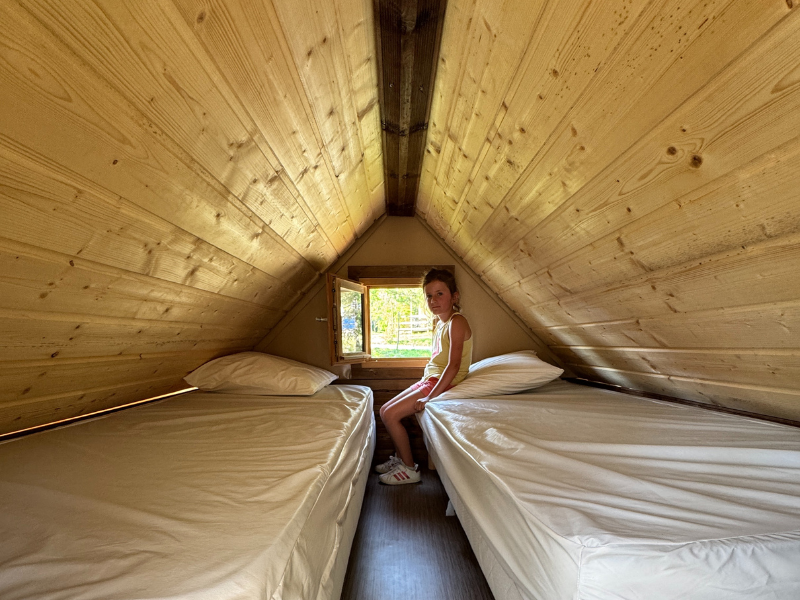 Designed for simple and functional comfort, it features a suspended sleeping area with two single beds for restful nights. Below, enjoy a dining space equipped with a table, chairs, and a fridge to savor your meals after a day on the coastal trails.
