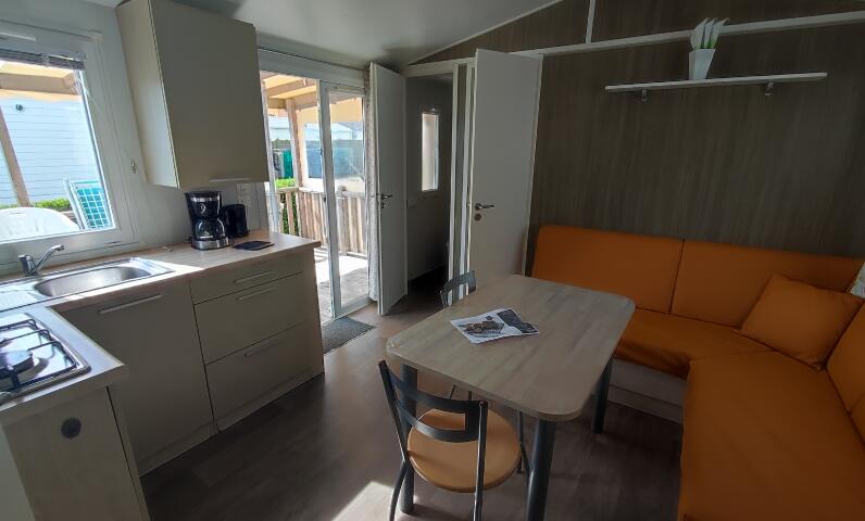 Enjoy a pleasant and relaxing stay in our 27 m² Comfort Mobile Home, ideal for families or friends. Inside, the bright living area features a comfortable sofa, a TV, and a fully equipped kitchen with gas hob, fridge with freezer compartment, coffee maker, microwave, and kettle, allowing you to prepare meals easily and share convivial moments.