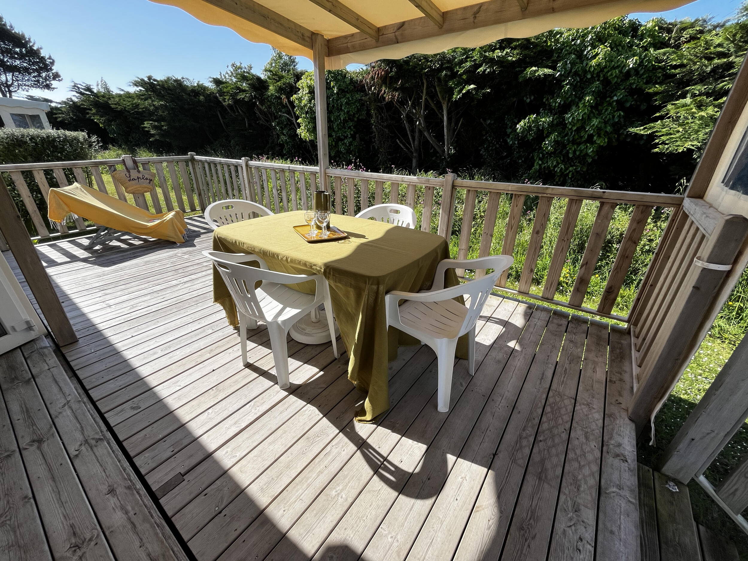 À l’extérieur, la terrasse en bois semi-couverte avec salon de jardin, mobilier de terrasse, bains de soleil, chiliennes et parasol est parfaite pour prendre vos repas, vous détendre ou profiter du soleil breton.