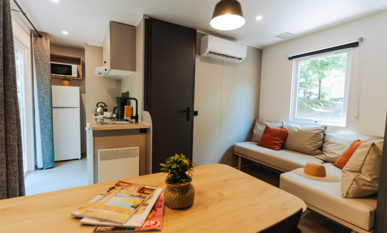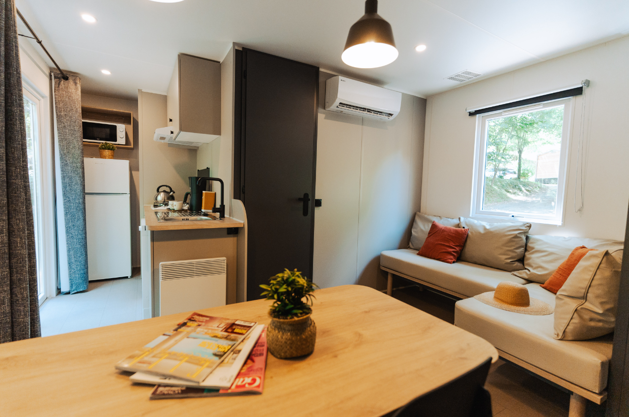 À l’intérieur, vous trouverez une pièce de vie lumineuse avec banquette, télévision et cuisine équipée : plaque de cuisson électrique, lave-vaisselle, grand frigo avec congélateur, cafetière Nespresso, micro-ondes, grille-pain et bouilloire. Chaque détail a été pensé pour votre confort et votre plaisir.