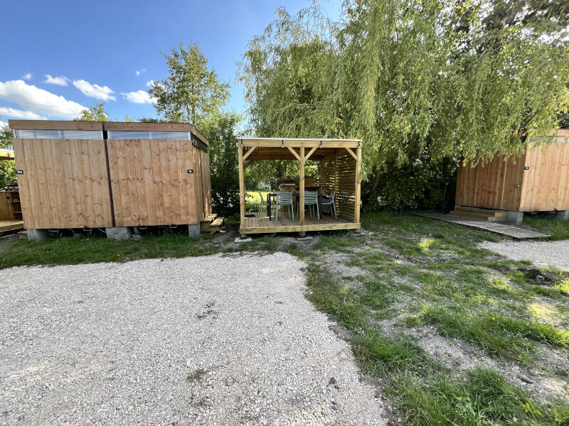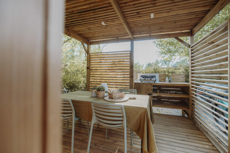 Het Garden Pack maakt uw verblijf compleet met praktische en gezellige buitenvoorzieningen: halfoverdekt terras, koelkast, plancha, tafel en stoelen – ideaal om maaltijden in de buitenlucht te nuttigen en volledig te genieten van luxe kamperen in Bretagne.