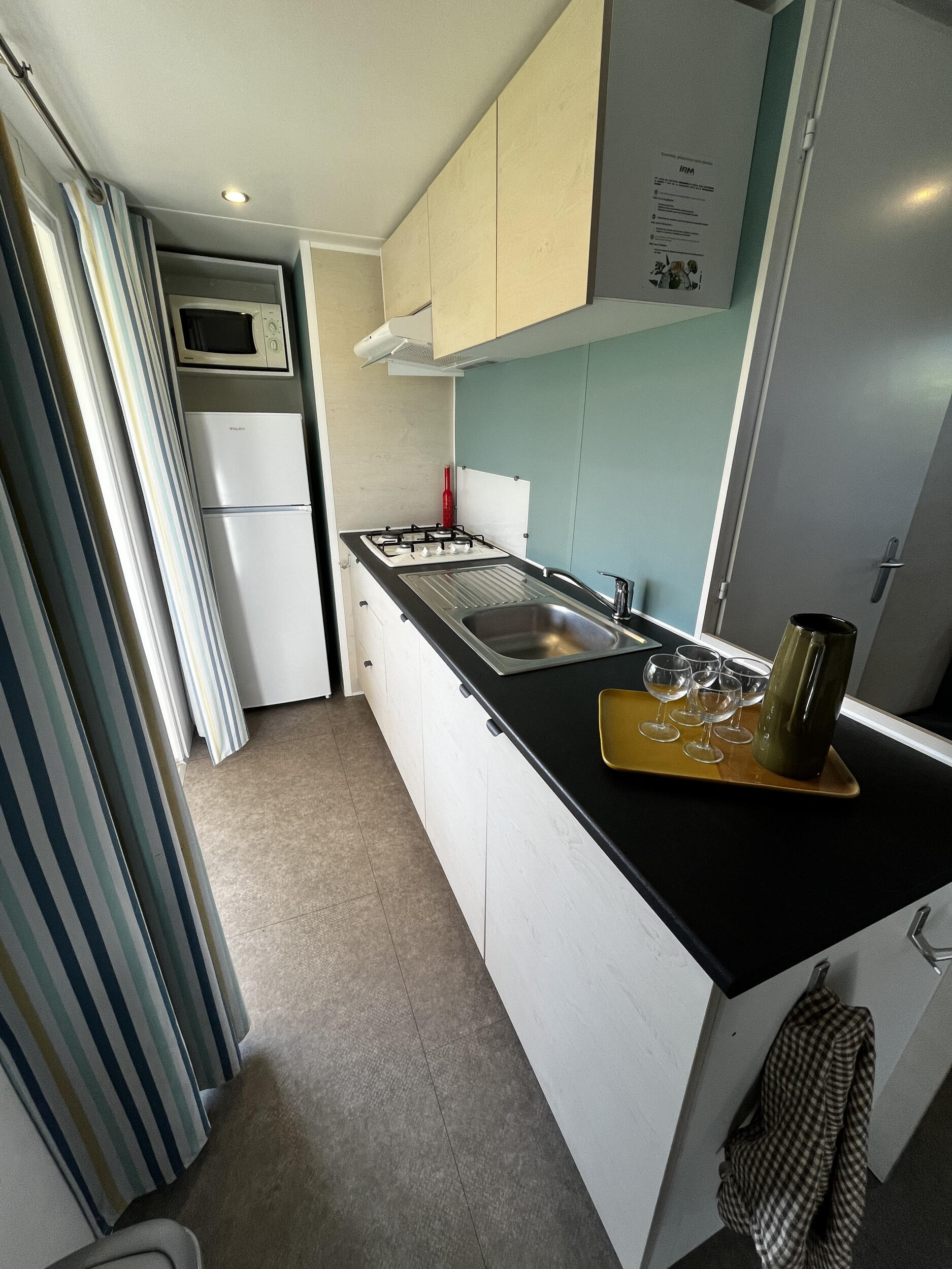 Geniet van een ruim en gezellig verblijf in onze Prestige Stacaravan met 3 slaapkamers, ideaal voor gezinnen of vriendengroepen. Het lichte interieur heeft een gezellige woonkamer met bank, tv en een volledig uitgeruste keuken: gasfornuis, grote koelkast met vriesvak, Nespresso-koffiemachine, magnetron en waterkoker om gemakkelijk maaltijden te bereiden.