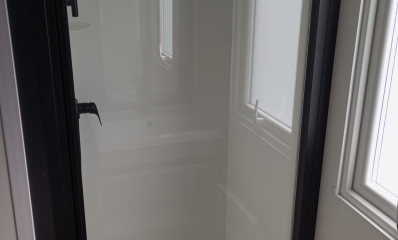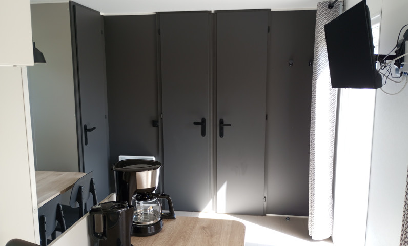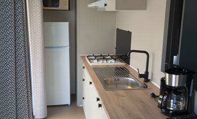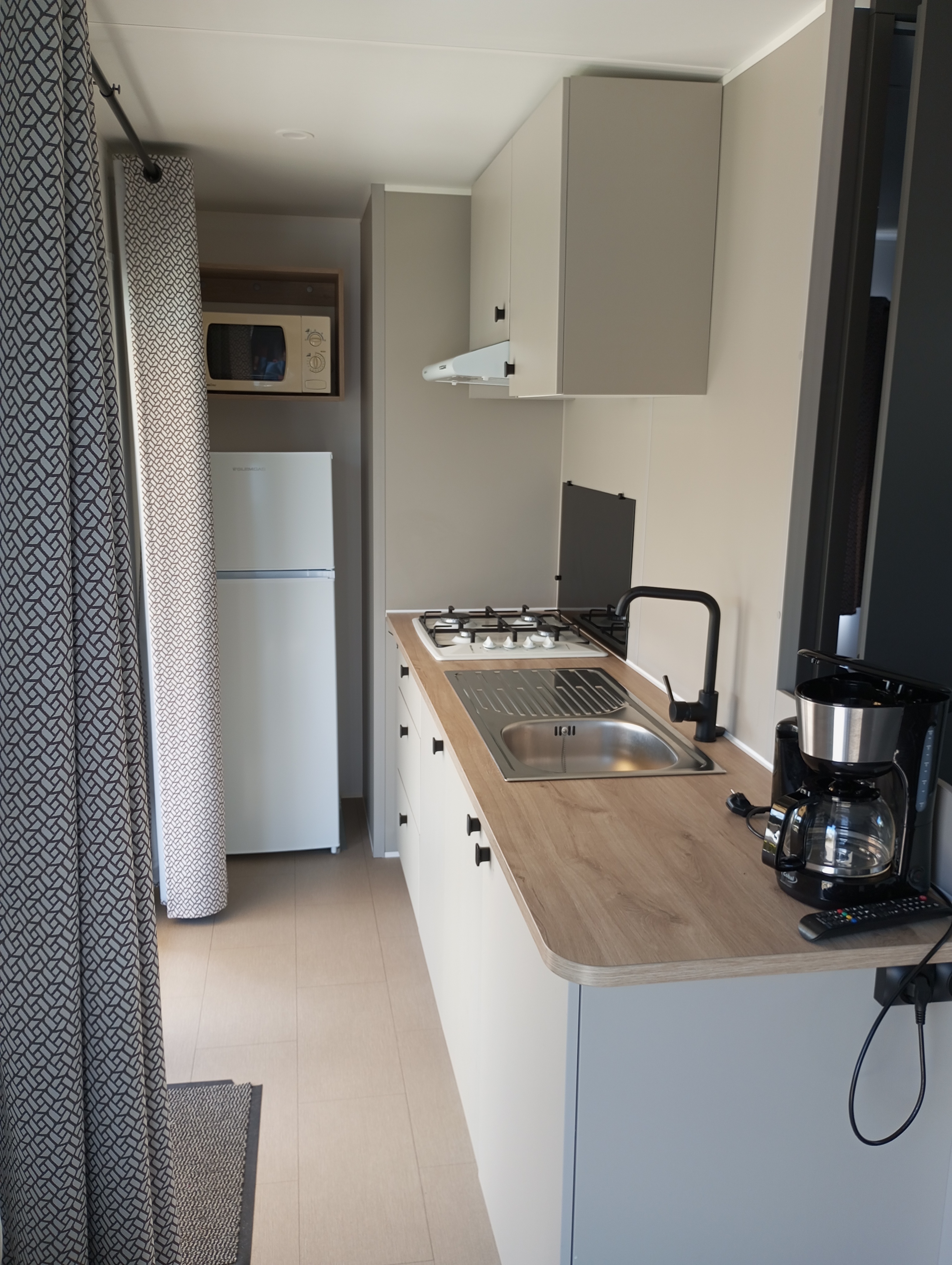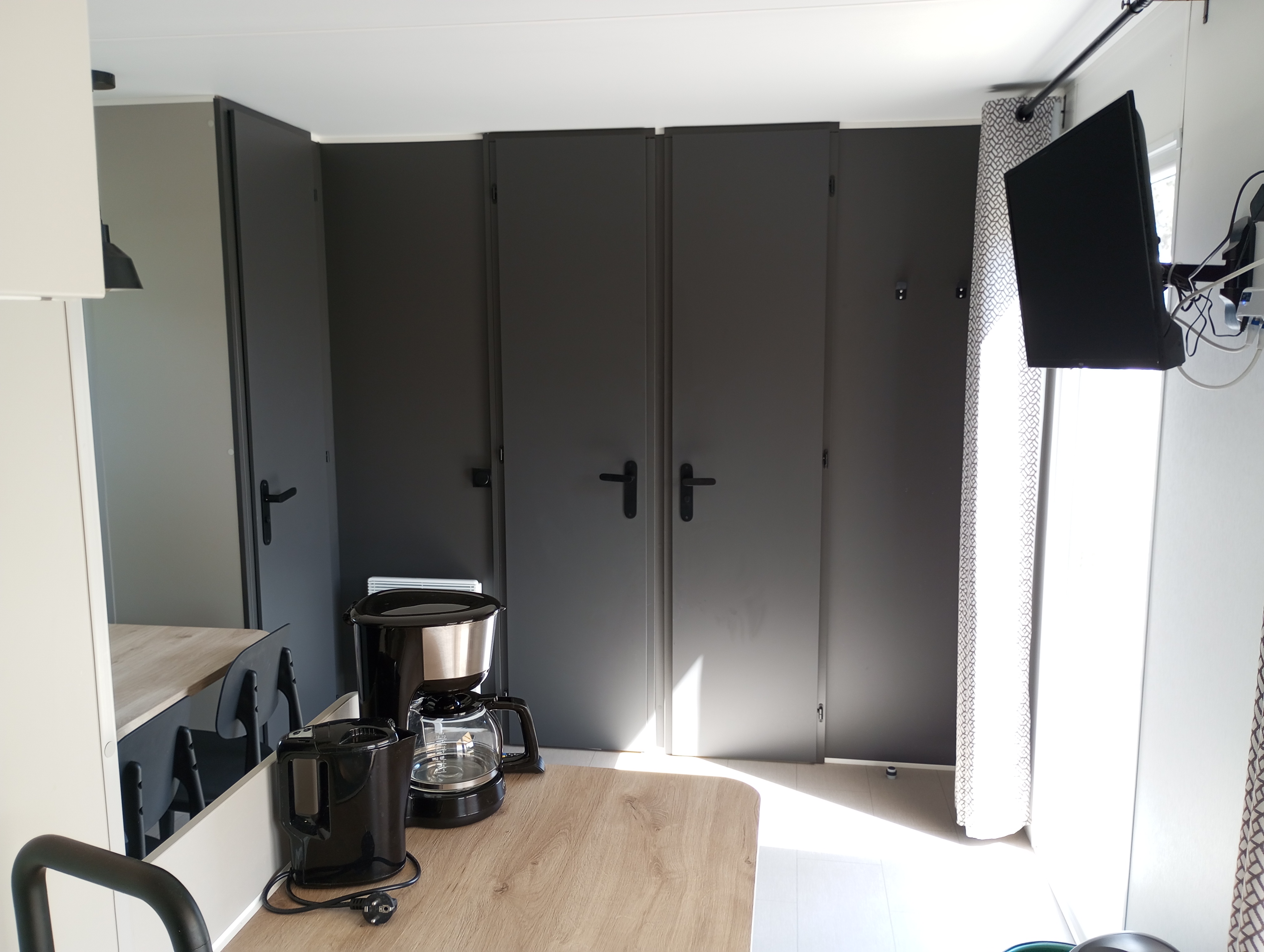 Binnen biedt de prestige plus 4-persoons stacaravan een warme en functionele ruimte. De woonkamer is voorzien van een comfortabele zitbank, een televisie en een moderne open keuken. Deze beschikt onder andere over een gaskookplaat, een koelkast met vriesvak, een koffiezetapparaat, een magnetron en een waterkoker. Alles is ontworpen om uw vakantie gemakkelijker te maken, van het bereiden van maaltijden tot ontspannen met het gezin.