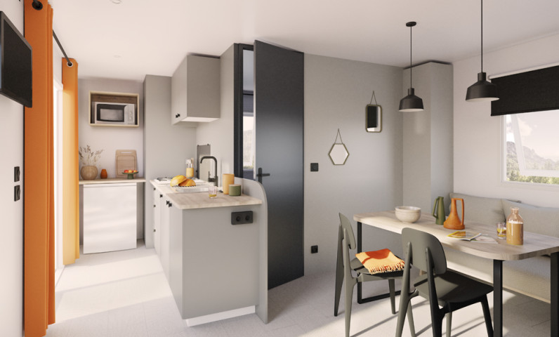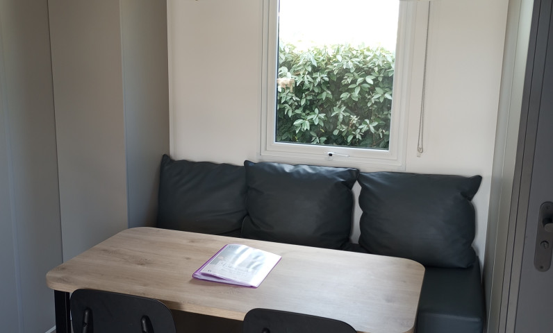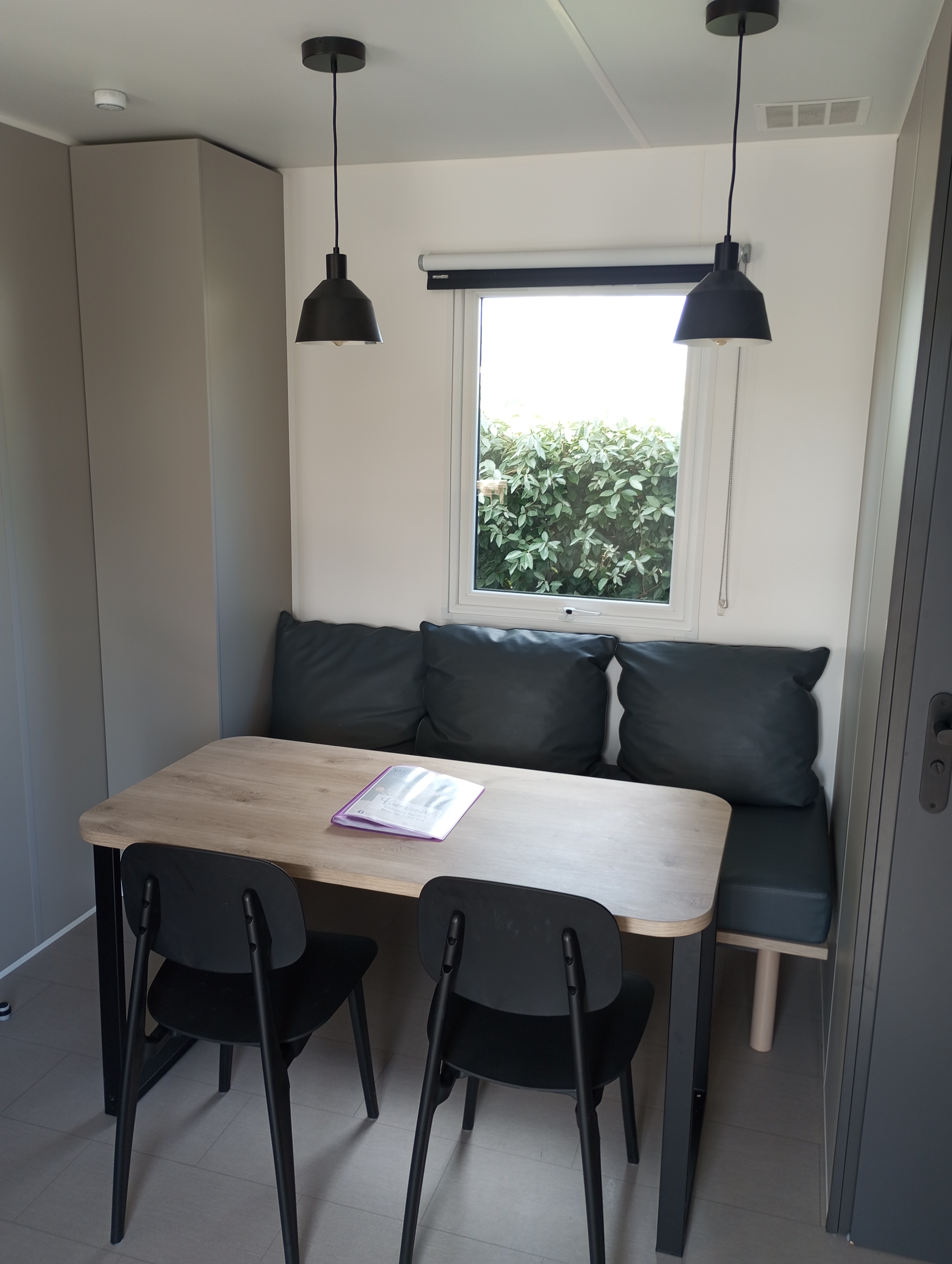 Door de geoptimaliseerde interieurindeling en complete uitrusting van de stacaravan kunt u optimaal genieten van elk moment. Het halfoverdekte terras, omgeven door kwaliteitsvol tuinmeubilair, is de ideale plek voor gezellige maaltijden of momenten van ontspanning buiten. De prestige plus stacaravan is een uitnodiging om te genieten van de zoetheid van het leven in Bretagne, in een natuurlijke en gastvrije omgeving.