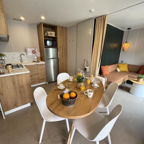 Geniet van een heerlijk ontspannen verblijf in deze Prestige stacaravan, perfect voor een rustige vakantie met z’n tweeën, met familie of vrienden. Het warme interieur biedt een combinatie van moderniteit en comfort: een gezellige bank, een televisie voor relaxte avonden en een volledig uitgeruste keuken (gaskookplaat, Nespresso, magnetron, waterkoker, koelkast met vriesvak) om in uw eigen tempo te koken.
