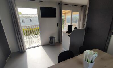 De geoptimaliseerde indeling binnen zorgt ervoor dat u elk moment optimaal kunt beleven, terwijl het half-overdekte terras met hoogwaardige tuinmeubelen de perfecte plek is voor gezellige maaltijden of ontspannen momenten in de buitenlucht. De Prestige Plus stacaravan nodigt uit om te genieten van de rustige levensstijl in Bretagne, in een natuurlijke en gastvrije omgeving.