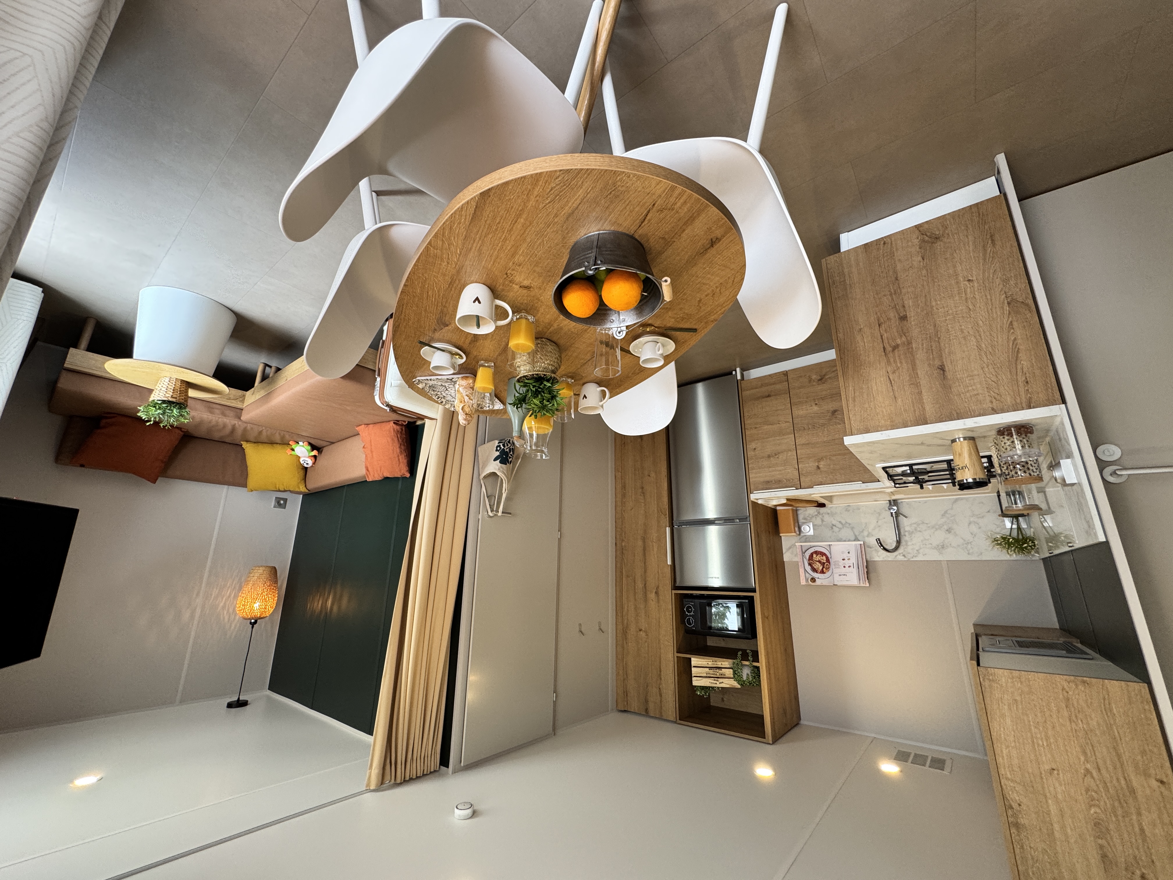 Het interieur is ontworpen om uw comfort en welzijn te maximaliseren. De lichte woonkamer omvat een comfortabele zithoek en een gezellige eethoek, terwijl de open keuken het bereiden van maaltijden eenvoudig maakt. Alles is doordacht ingericht zodat u volop van uw vakantie kunt genieten, of het nu gaat om koken, samen gezellig zijn of ontspannen na een dag vol ontdekkingen.